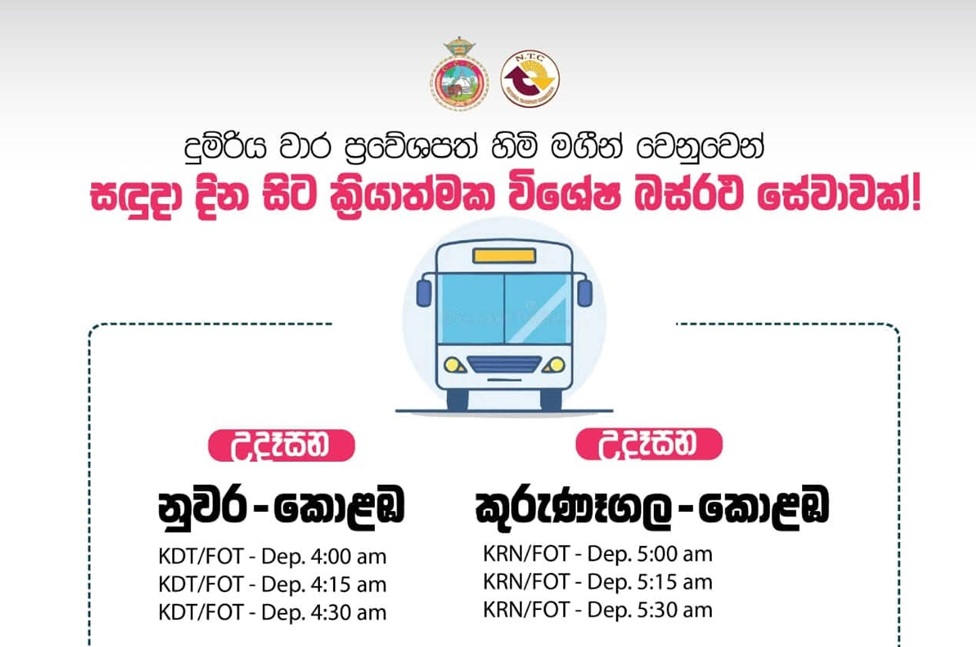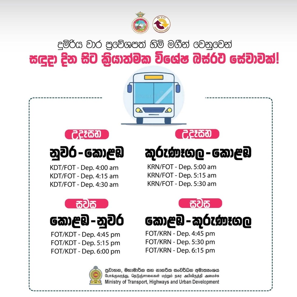මහනුවර සිට කොළඹ දක්වා සහ කුරුණෑගල සිට කොළඹ දක්වා රැකියා සඳහා ගමන් කරන දුම්රිය වාර ප්රවේශපත්ර හිමියන්ට දුම්රිය සේවාවලට බාධා ඇති බැවින් බස් රථවලින් ගමන් කිරීමට අවසර දෙනු ලැබේ. මෙම විධිවිධානය 2025 දෙසැම්බර් 08 වන සඳුදා සිට ක්රියාත්මක වේ.
