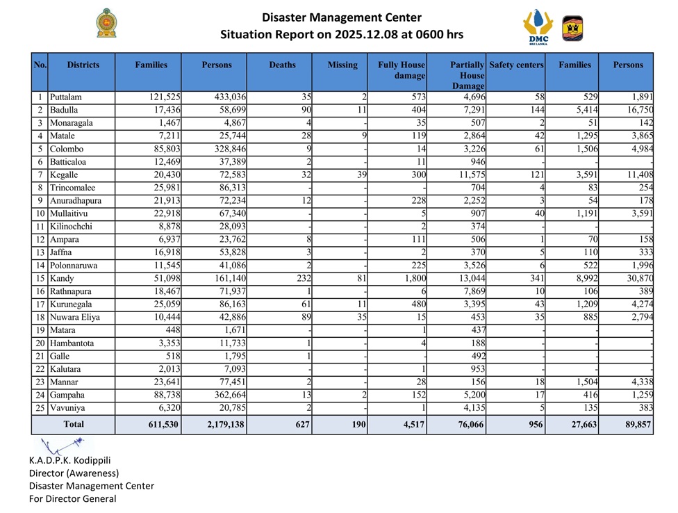 ජාතික ආපදා කළමනාකරණ මධ්යස්ථානය විසින් අද (08) දින පෙරවරු 06.00ට නිකුත් කළ නිල වාර්තාව අනුව දිට්වා සුළි කුණාටුවෙන් සිදු වූ මරණ සංඛ්යාව 627 දක්වා ඉහළ ගොස් ඇති අතර අතුරුදන් වූ පුද්ගලයින් සංඛ්යාව 190ක් වී ඇත. පවුල් 611, 530කට අයත් පුද්ගලයින් 21,79,138ක් පීඩාවට පත්ව ඇති අතර නිවාස 4517ක් සම්පූර්ණයෙන් විනාශ වී ඇත. අර්ධ වශයෙන් හානියට පත් නිවාස සංඛ්යාව 76,066කි. ආරක්ෂිත නිවාස 956ක පවුල් 27,663කට අයත් පුද්ගලයින් 89,857ක් රැකවරණය ලබති.