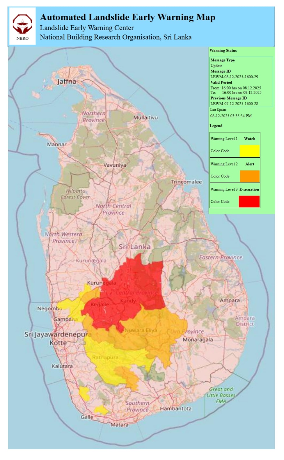 ජාතික ගොඩනැගිලි පර්යේෂණ සංවිධානය විසින් අද (08) දින පස්වරු 12.00ට නිකුත් කළ නිල නිවේදනය මගින් මහ නුවර දිස්ත්‍රික්කයේ  හතරලියද්ද, යටිනුවර, උඩුදුම්බර, පාතහේවාහැට, මැදදුම්බර, පස්බාගේ කෝරළය, දෙල්තොට, පූජාපිටිය, ගඟ ඉහළ කෝරළය, පන්විල, ගඟවට කෝරළය, උඩපළාත, හාරිස්පත්තුව, කුණ්ඩසාලේ, මිනිපේ, දොළුව, තුම්පනේ, අකුරණ, උඩුනුවර හා පාතදුම්බර යන ප්‍රාදේශීය ලේකම් කොට්ඨාශවලට සහ ග්‍රාම නිලධාරී වයසම්වලට, කෑගල්ල දිස්ත්‍රික්කයේ කෑගල්ල, ගලිගමුව, මාවනැල්ල, බුලත්කොහුපිටිය, අරණායක, යටියන්තොට, රඹුක්කන සහ වරකාපොල යන ප්‍රාදේශීය ලේකම් කොට්ඨාශවලට සහ ග්‍රාම නිලධාරී වයසම්වලට, කුරුණෑගල දිස්ත්‍රික්කයේ මාවතගම, මල්ලවපිටිය සහ රිදීගම න ප්‍රාදේශීය ලේකම් කොට්ඨාශවලට සහ ග්‍රාම නිලධාරී වයසම්වලට සහ මාතලේ දිස්ත්‍රික්කයේ නාඋල, විල්ගමුව, පල්ලේපොල, අඹන්ගඟ කෝරළේ, ලග්ගල පල්ලේගම, උකුවෙල, රත්තොට, මාතලේ සහ යටවත්ත යන ප්‍රාදේශීය ලේකම් කොට්ඨාශවලට සහ ග්‍රාම නිලධාරී වයසම්වලට, නායයෑමේ අදියර 03 (ඉවත් වීම) රතු නිවේදන නිකුත් කර ඇත.