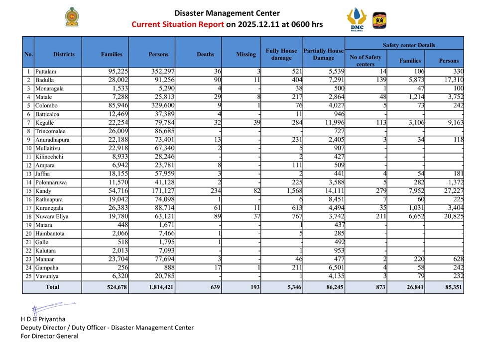 ආපදා කළමනාකරණ මධ්යස්ථානය විසින් අද (11) දින පෙ.ව 06.00ට යාවත් කාලීන කරන ලද නවතම තත්ත්ව වාර්තා අනුව දිට්වා සුළි කුණාටුවෙන් මිය ගිය පුද්ගලයින් සංඛ්යාව 636ක් බවත් පුද්ගලයින් 193 දෙදෙනක් අතුරුදන්ව සිටී. පවුල් 524,678කට අයත් පුද්ගලයින් 18,14,421 දෙනකු පීඩාවට පත්ව සිටින අතර ආරක්ෂිත මධ්යස්ථාන 873ක පවුල් 26,841කට අයත් පුද්ගලයින් 85,351දෙනක් රැකවරණ ලබති.